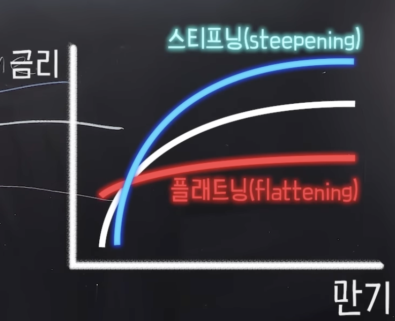 장기채권 금리는 높은 상태, 단기채권 금리는 낮은 상태를 유지하면 곡선이 가팔라진다고 표현하여 금리 스티프닝(Steepening)이라고 하고, 반대로 장기채권 금리가 낮은 상태, 단기채권 금리는 높은 상태를 유지하면 곡선이 평탄해진다고 표현하여 금리 플래트닝(Flattening)이라고 합니다.