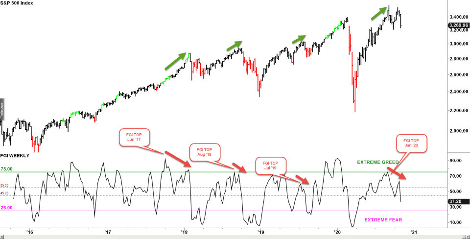 일간 FGI는 노이즈가 너무 많으며, FGI WEEKLY 차트(아래)에 표시했을 때 가장 유익한 결과가 나온다는 것을 발견하였다고 합니다.