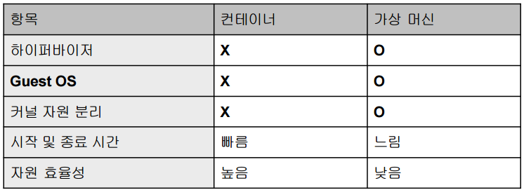 - 경량화 (Lightweight) : 컨테이너는 호스트 커널을 활용하고 공유한다.