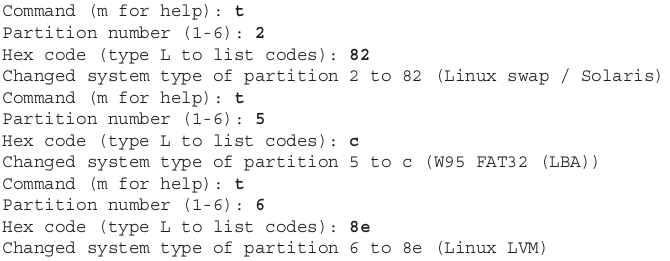 3. 파티션은 스왑공간(82), FAT32(x), Linux LVM(8e)으로 사용하려면 t를 통해 파티션 형식을 지정한다.