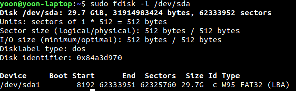 3. 이제 fdisk 명령을 통해 USB 드라이브에 파티션을 만든다.