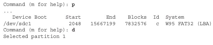 4. fdisk 명령 모드로 들어왔다. 파티션 전체를 확인하기 위해선 p를 사용하고, 특정 파티션을 삭제하는 명령은 d이다.