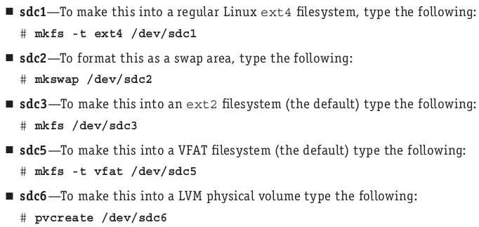 5. 이제 파티션들이 서로 다른 형식의 내용물을 담는다. 이 파일 시스템이나 스왑 영역으로 조직하기 위해 다음과 같이 다른 명령이 필요하다.