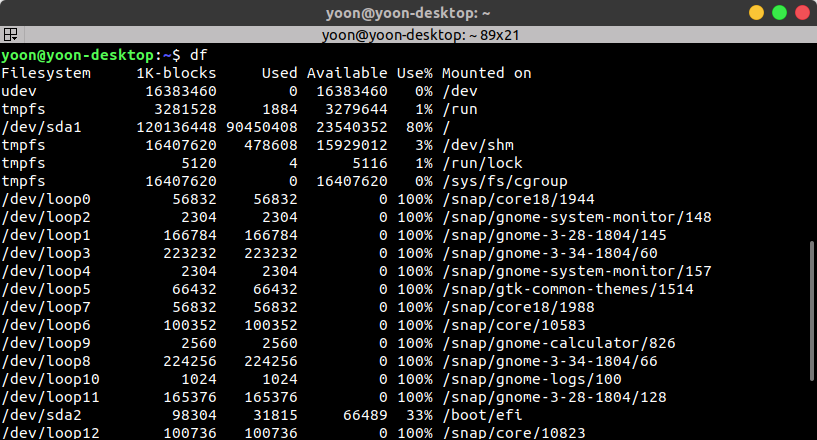 df 로 파일시스템의 남은 사용 가능한 공간을 알 수 있다.