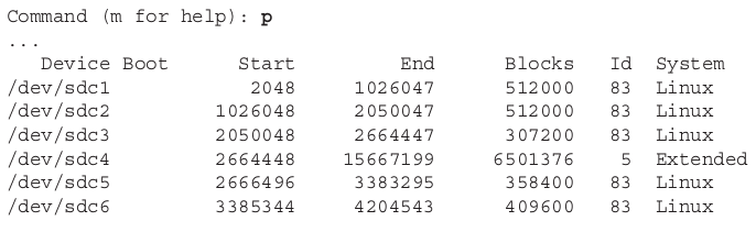 1. 위에서 fdisk를 통해 파티션을 만들었 듯이 이번에는 파티션 6개를 만들어준다. 3개까진 primary partition으로 만들고 하나는 extended로 만들어 2개를 추가로 만든다. (자세한건 책에)