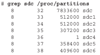 4. w를 통해 저장한다.변경 내용이 모두 적용되면 커널이 이를 알고 있는지 확인해야한다. /proc/partitions에서 찾아본다.
