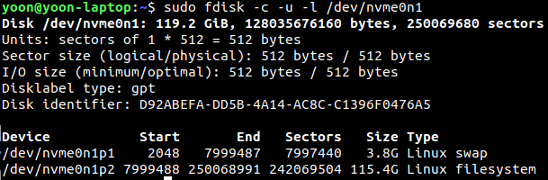 섹터 단위로 파티션 크기를 나타내려면 u 옵션을 추가, DOS 호환성 모드를 끄려면 c 옵션을 추가한다.