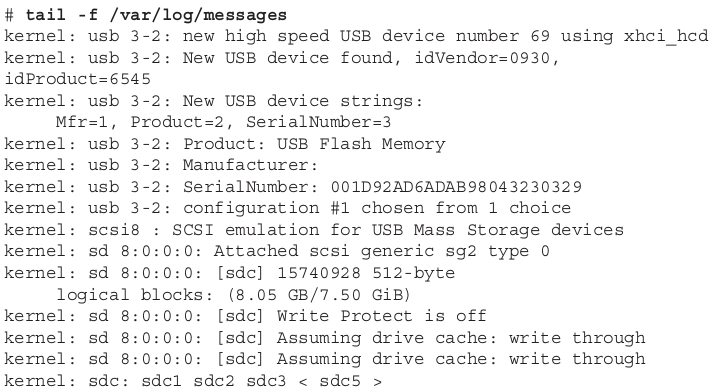 1. 먼저 tail 명령을 통해 USB 드라이버의 장치명을 파악한다.