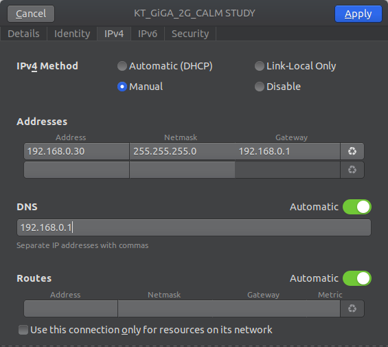 다음과 같은 설정창에서 IP주소, Netmask(서브넷), Gateway, DNS 지정가능.