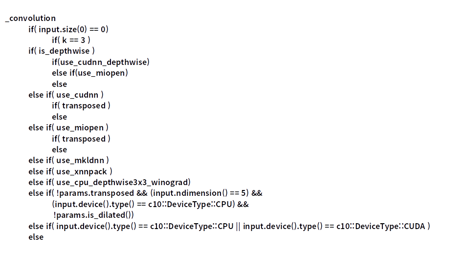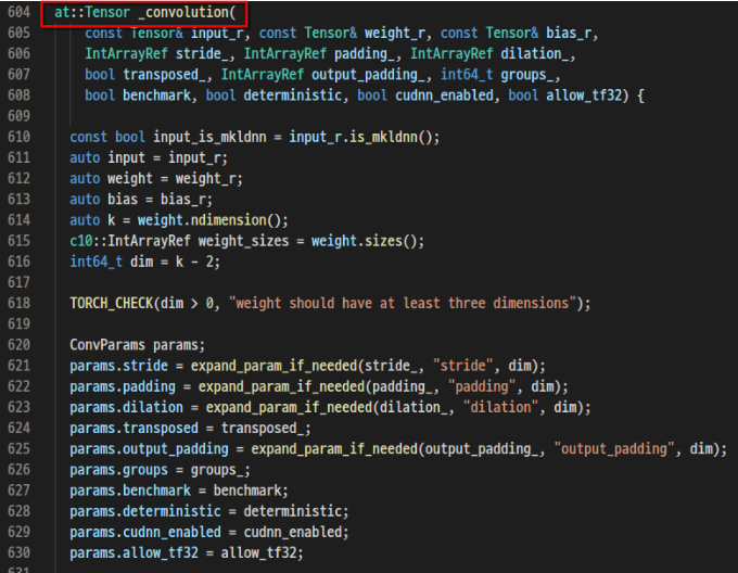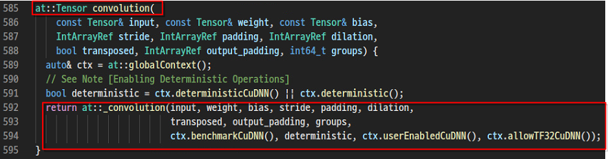 at::convolution 함수는 다시 at::_convolution 함수를 return하는데, 중간에 벤치 마크 모드 활성 여부인 benchmarkCuDNN, Randomness제어인 Deterministic 등을 bool 타입으로 제어해주는데, 나는 그것보단 Conv 함수의 소스코드를 찾는게 우선이기 때문에 다루지 않았따.