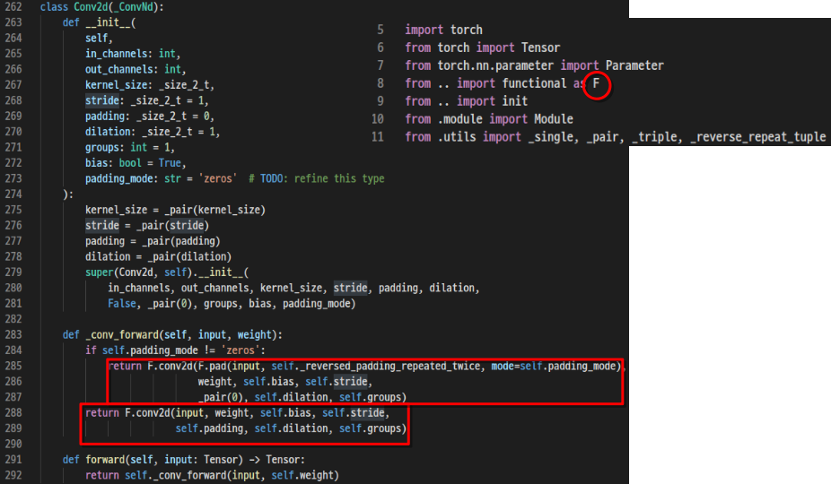 Conv2d forward 함수에서는 다시 F.conv2d를 반환해준다. F는 functional을 import한 것이므로 functional 모듈을 찾아보았다.