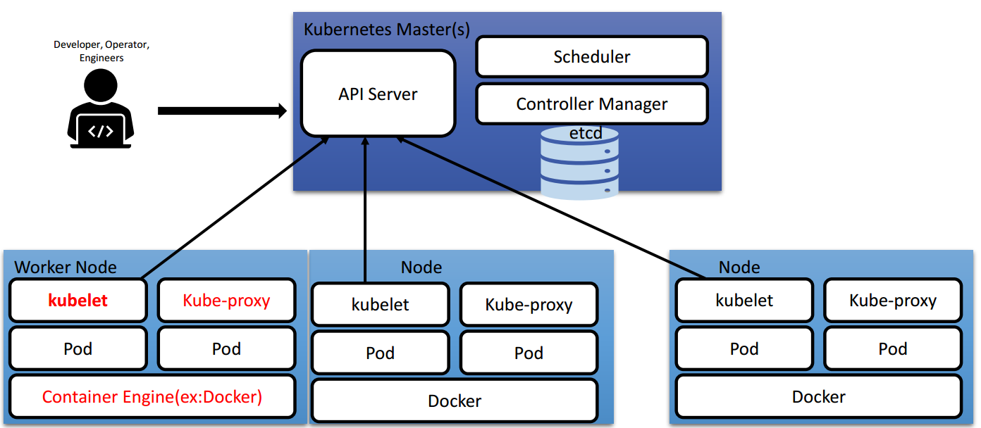Developer가 API로 명령을 내리면, API server를 통해 etcd에 그 명령이 기록되게 된다. 그러면 kubelet이 API 서버를 통해 지속적으로 etcd라는 칠판을 주시하므로 쓰인 정보를 보고 상황에 맞게 행동하는 것. 즉 etcd에 의도하고 싶은 상태를 써놓기만 하면 kubelet들이 쳐다보고 알아서 처리해준다는 뜻이다.