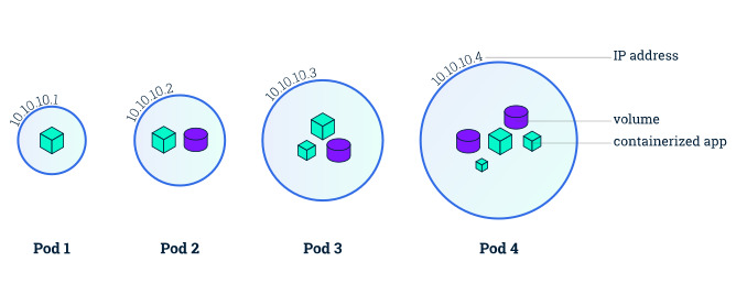 Volume(공유 스토리지)이나 컨테이너들이 다양하게 구성 가능하다. 각각의 Pod는 일련의 IP주소를 부여받고, Pod 안에서의 각 컨테이너나 볼륨은 포트를 통해 구별할 수 있다. 배포를 한다는 것은 컨테이너와 함께 그 컨테이너를 포함하는 Pod를 생성하는 것이다. Pod는 애플리케이션 플랫폼 상의 최소 단위이다. 이렇게 생성된 Pod는 스케줄링 된 Node에게 묶여지게 된다.