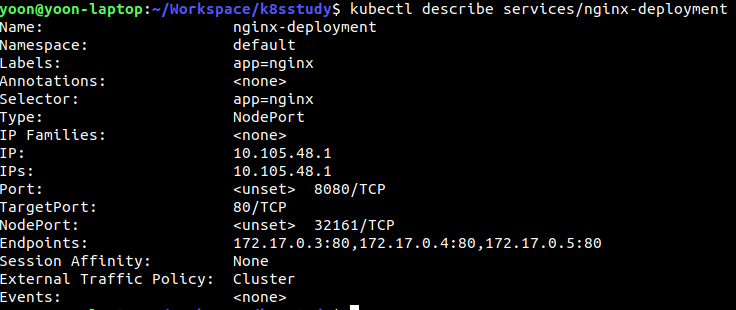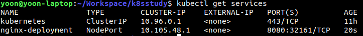 nginx-deployment라는 NodePort Service가 생성되었다.