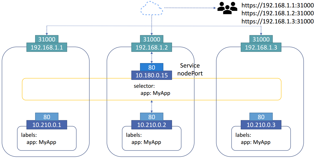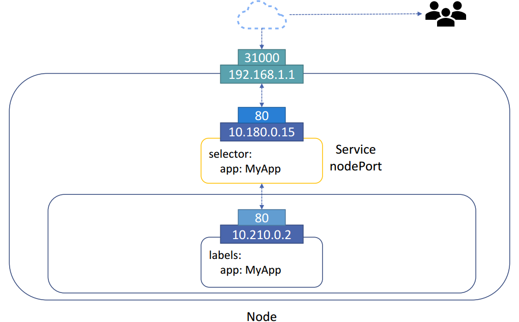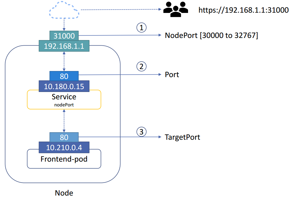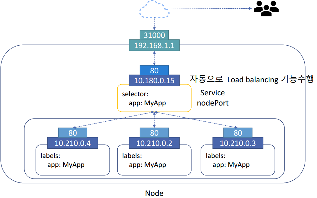 외부의 아이피가 192.168.1.1이면 31000번 Port를 통해 Node에 접근할 수 있다. (NodePort 서비스)