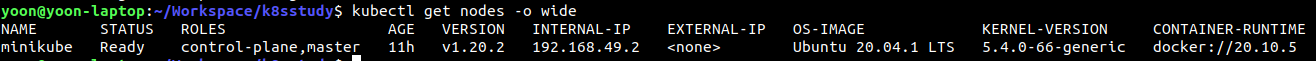 아래 명령으로 nodes들의 정보를 자세히 표시 가능하다. minikube라는 노드에 접근해야 하므로 minikube 노드의 ip주소를 확인한다.