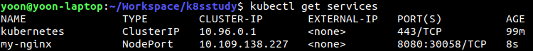# 해당 명령은 현재까지는 아직 nodeport를 지정할 수 있는 파라미터가 없어 30000~32767 사이 포트가 랜덤으로 부여된다