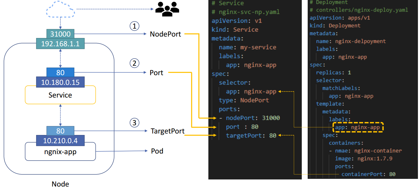 Node의 어느 Service를..? 어느 Pod로..?라는 의문이 생기는데, 이걸 yaml 파일에 미리 정의해두어 특정 Pod의 Application을 접근할 수 있게 되는 것이다.