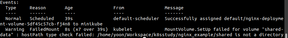 나의 경우 minikube를 사용하여 실습하였는데 minikube가 도커 컨테이너라는 사실을 잊고, local 저장소의 shared 디렉터리를 만들었던 것이 문제였다. 자세한 내용은 쿠버네티스 volume 마운트 편에 적어야지.