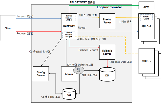 구성은 크게 GATEWAY, EUREKA, FALLBACK-SERVER, ADMIN, DB, CONFIG-SERVER, GIT로 구성 되어있다.