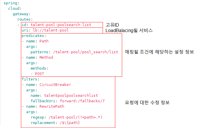 고유ID, 목적지 URI, Predicate, Filter로 구성된 구성요소.